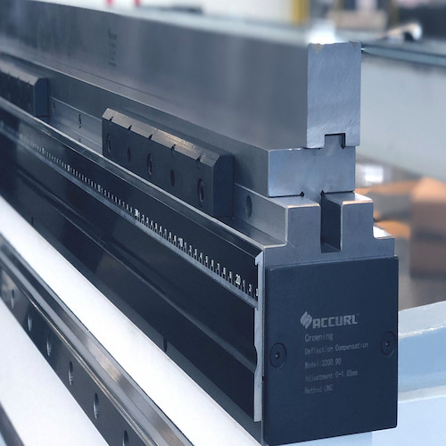 Compensación de la deflexión: Al doblar la superficie larga de la mesa, el deslizador y la superficie de la mesa sufren una ligera deformación debido a la fuerza aplicada, lo que resulta en ángulos medios imprecisos. La función de compensación de la deflexión (hidráulica o mecánica) contrarresta automáticamente esta deformación y es fundamental para garantizar la precisión de doblado de piezas largas. Se recomienda encarecidamente su instalación.